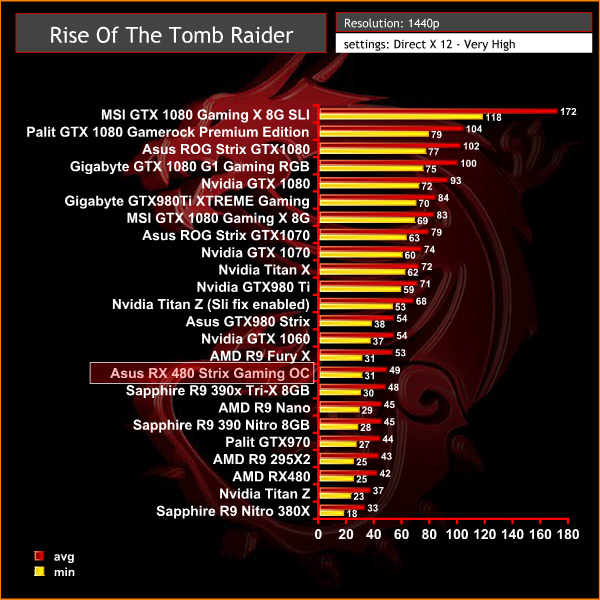 The Asus RX 480 Strix Gaming OC manages to outperform the Sapphire R9 390X by a single frame per second, holding a 49 fps average.