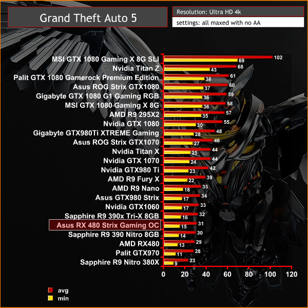 At Ultra HD 4k performance is very closely matched with the Sapphire R9 390X Tri X 8GB, averaging 31 frames per second.