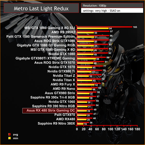 A very demanding engine. The Asus RX 480 Strix Gaming OC averages 48 frames per second, putting it slightly ahead of the Palit GTX970.