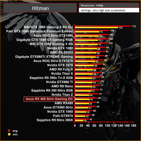 At 1440p the Asus RX 480 Strix Gaming OC maintains a lead over the GTX1060, falling in behind the Titan Z.