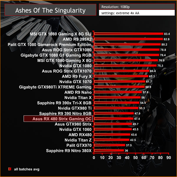 At 1080p the Asus RX 480 Strix Gaming OC averages 47.4 frames per second putting it just ahead of the Asus GTX980 Strix and GTX 1060 reference card.