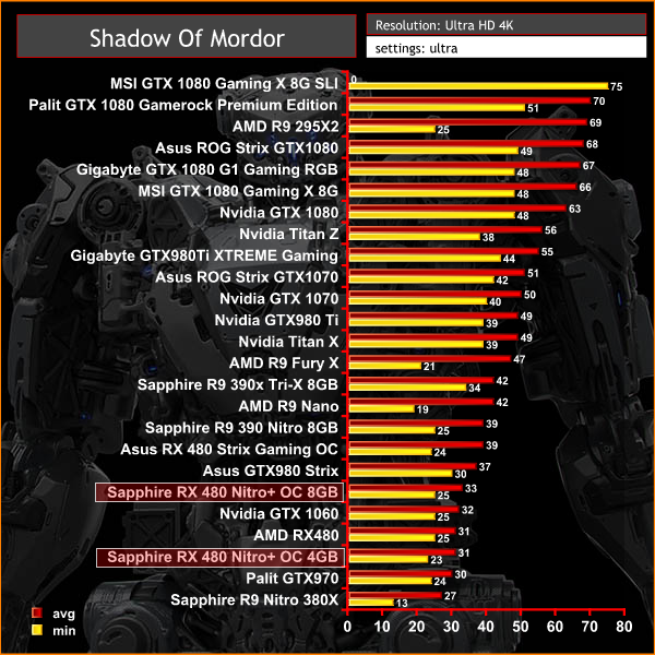 At Ultra HD 4k you really want to be using a GTX1080 to get smooth frame rates with this engine at high image quality settings. That said, we can see the Nitro+ OC 8GB card pips the GTX1060 by a single frame per second.