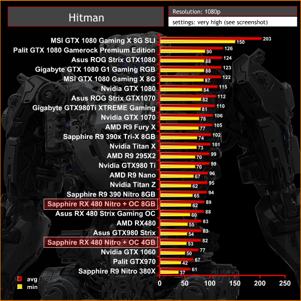 No problems powering this engine at 1080p. The 8GB shows the benefit that it can run at a constant 60fps+, where as the 4GB, slower card drops to just above 50fps from time to time.