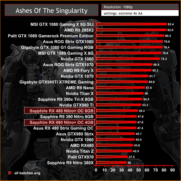 The 8GB Nitro+ OC card puts in a very good showing at 1080p, even outperforming the excellent Sapphire R9 390 Nitro 8GB from the previous generation.