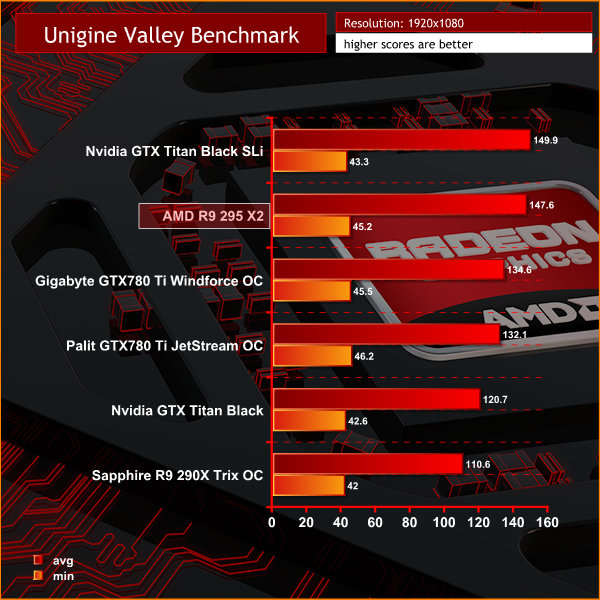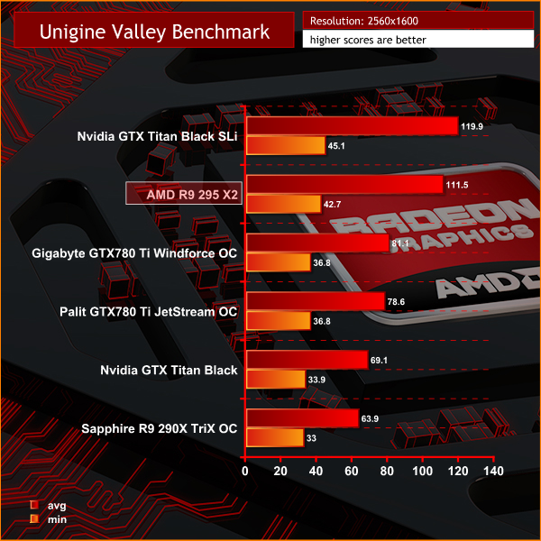 Very closely matched between the AMD R9 295 X2 and Titan Black's in SLi, although the Nvidia cards have the slight performance edge in this benchmark at both resolutions.