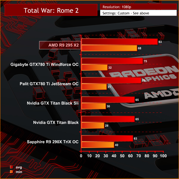 We couldn't get SLi to work properly with ROME 2, and the Sli Titan Black cards are no faster than the single card. Even with some minor CPU limiting we can see just how far ahead the AMD R9 295 X2 card is in this particular game at 1080p.