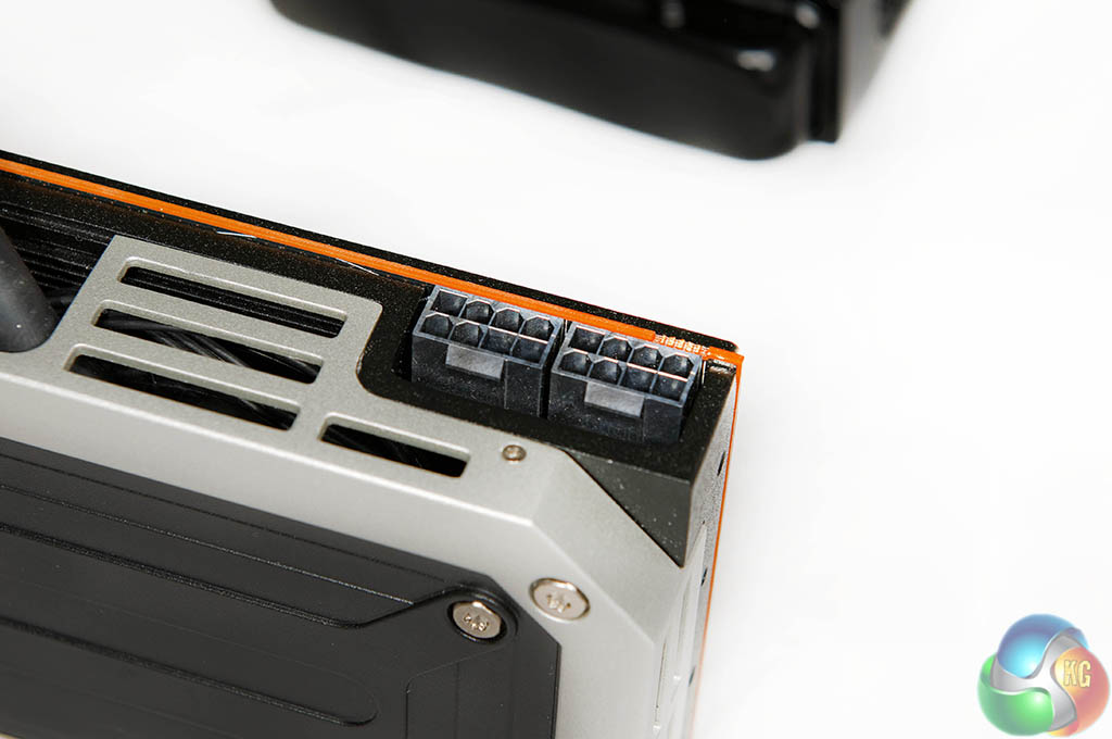 There are two eight pin PCI e connectors on the card. As mentioned on the last page the power supply must have two 8 Pin PCIe power connectors that can each supply 28A of dedicated current.