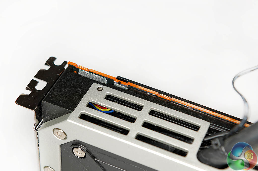 The rear of the card houses a metal backplate to protect the PCB, and to enhance cooling performance. Both GPU cooling mounts are visible.