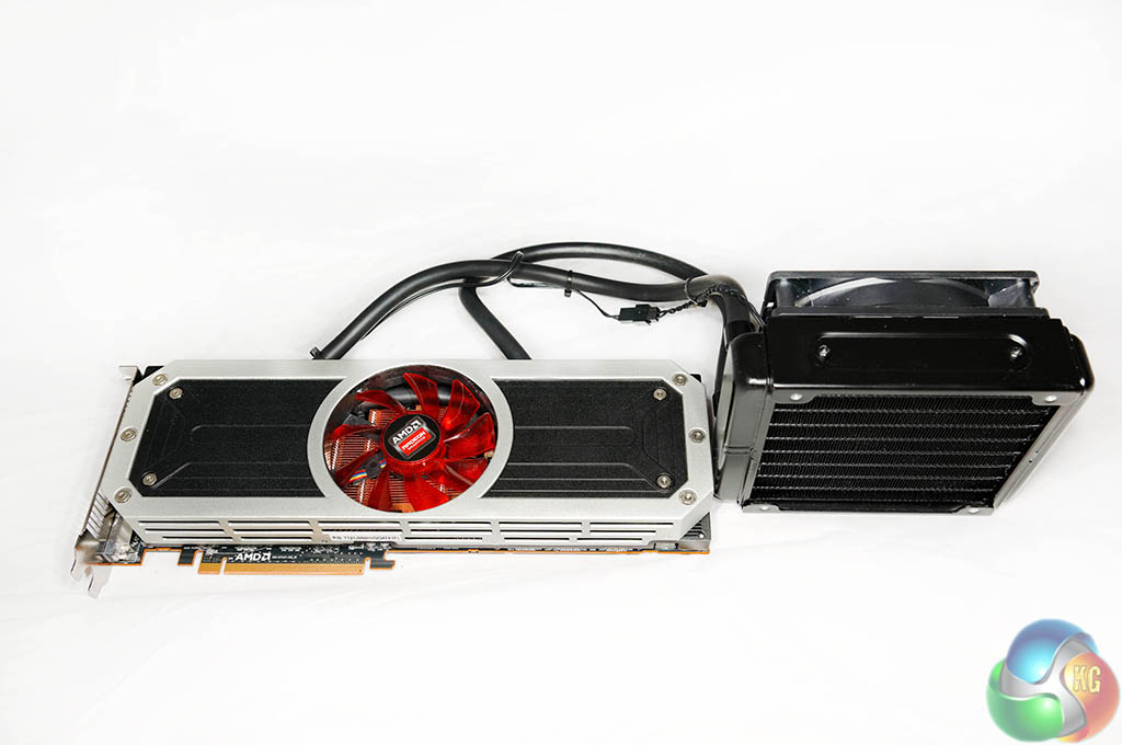 The two images above show the R9 295 X2 ‘layers' – with the cooler removed in various sections. The memory and VRM's are cooled by a copper heatsink with the fan pushing air directly overhead, and the dual Asetek blocks are installed over the GPU cores on either side of the PCB. The pumps are integrated into the cooling heads.