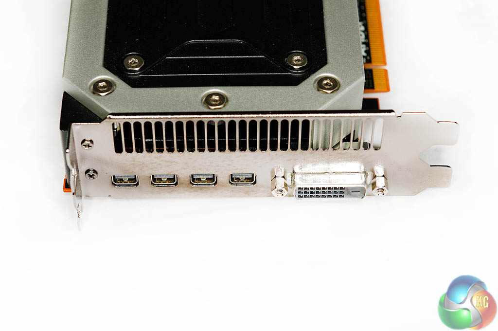 The card is a ‘true' 2 slot design and it has a dual link DVI connector, along with four mini DisplayPort connectors. We had to use a mini DisplayPort converter cable for compatibility with our Asus PQ321QE monitor. We do hope AMD partners bundle at least one of these mini DisplayPort converters.