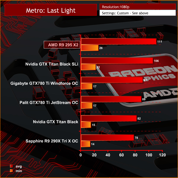 A very demanding engine at these settings, and the Nvidia GTX Titan Black cards in Sli show the other cards a clean pair of heels, even at 1080p. The AMD R9 295 X2 however claims top position, averaging 111 frames per second.