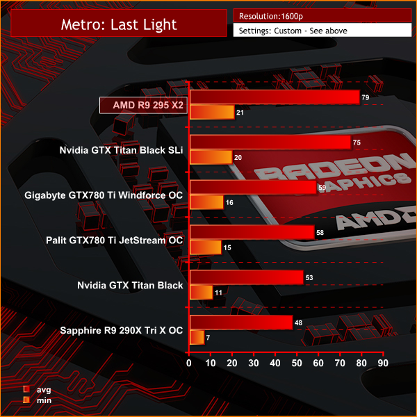 Again, the AMD R9 295 X2 claims top position, averaging 79 frames per second.