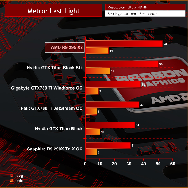 A close run battle for the top position, with the AMD R9 295 X2 managing a minor performance edge.