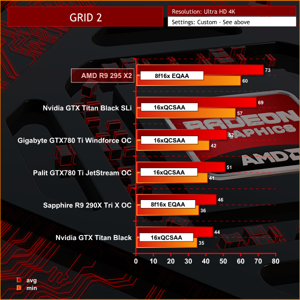 There is no doubt that the AMD R9 295 X2 gives the best experience in GRID 2 at Ultra HD 4K. Even though the IQ settings are inherently different due to Nvidia and AMD driver configurations, you would be hard pressed to notice any ‘real world' image quality differences between the AMD R9 295 X2 and the Nvidia GTX Titan Black cards running in SLi.