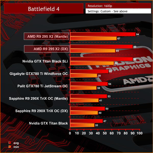 The AMD R9 295 X2 takes the top position at 1600p, just ousting the SLI'd GTX Titan Black cards. MANTLE rendering scored a little higher than the Direct X rendering mode.