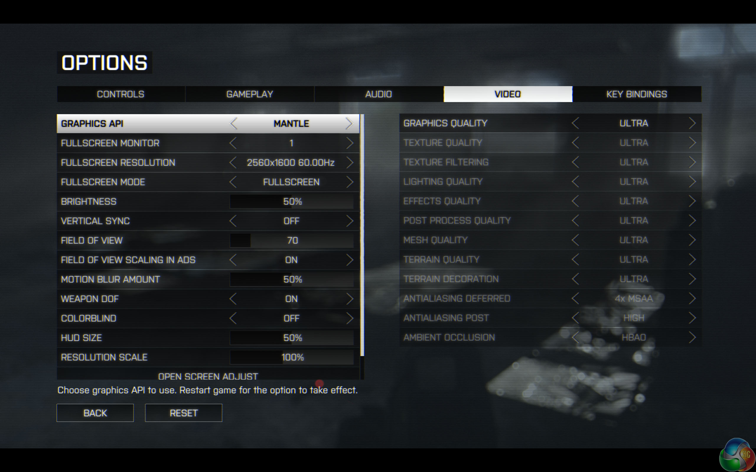 We test at 2560×1600 with the image quality settings on the ‘ULTRA' preset. We test the AMD hardware with both Direct X and AMD's Mantle rendering. Nvidia hardware is tested with Direct X rendering.