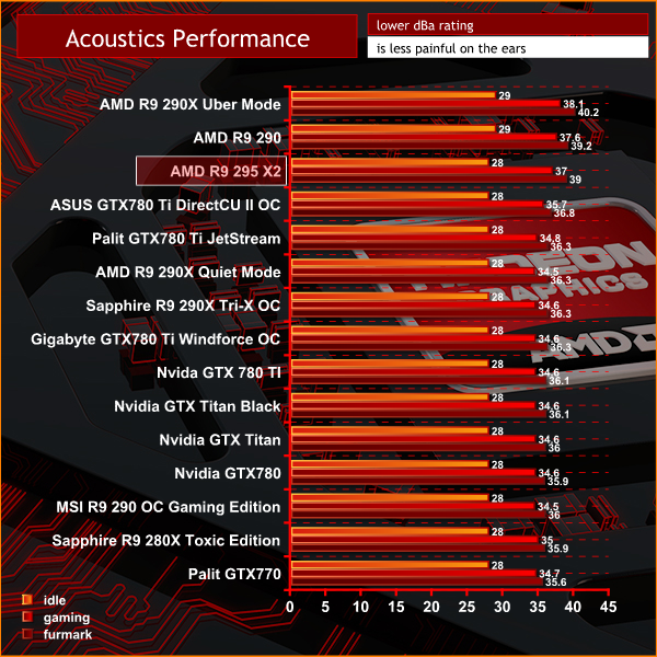 We measure from a distance of around 1 meter from the closed chassis and 4 foot from the ground to mirror a real world situation. Ambient noise in the room measures close to the limits of our sound meter at 28dBa. It isn’t a real world situation to be measuring with a case panel off only a few centimeters away from a video card. Our noise figures may therefore be lower than other publications who record at closer distances, or without a fully closed case muting the noise.