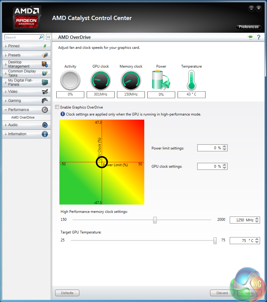 As we previously explained on R9 290/X launch day, the Catalyst Control Center has been redesigned to accommodate the new PowerTune technology. Overclocking and Power are now linked into a ‘2 dimensional heatmap'. AMD have said that this design makes it easier for the end user to adjust product performance. The R9 290/X and R9 295 X2 use a dynamic engine clock and overdriving the core speed works on a percentage.