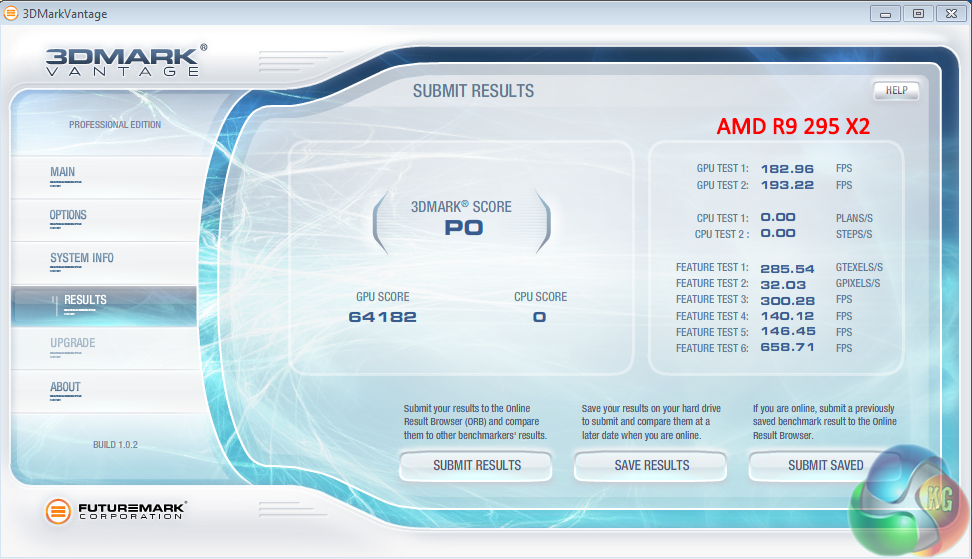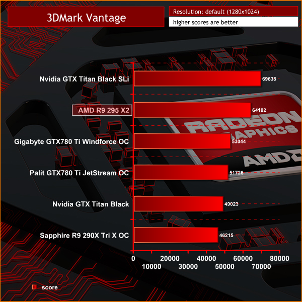 The Nvidia GTX Titan Black cards in SLi win this older Direct X 10 benchmark, scoring 69,638 points, around 5,000 more than the AMD R9 295 X2.