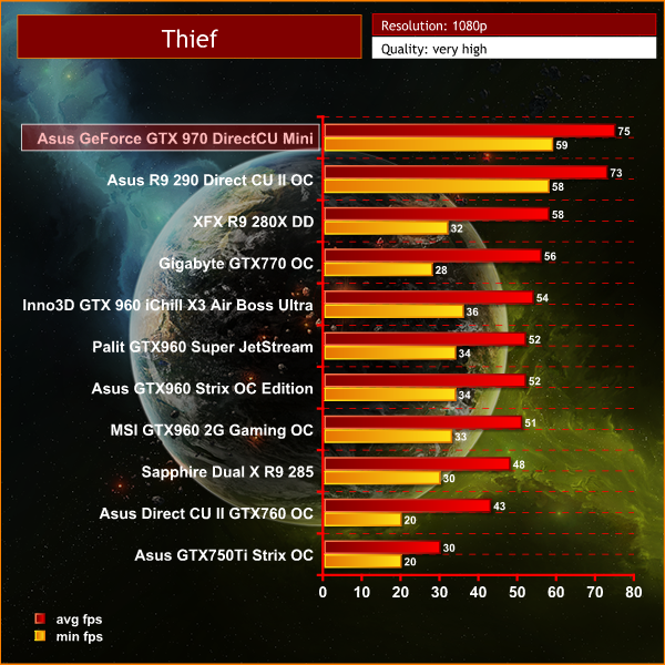 At 1080p, the Asus GeForce GTX 970 DirectCU Mini has a tiny performance advantage over the R9 290 OC, this drops at 1440p, although the minimum frame rate is higher, translating into a better gaming experience.