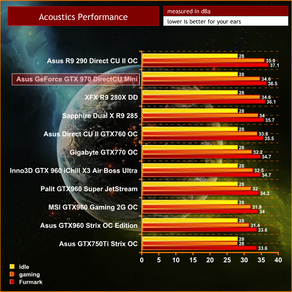 We measure from a distance of around 1 meter from the closed chassis and 4 foot from the ground to mirror a real world situation. Ambient noise in the room measures close to the limits of our sound meter at 28dBa. Why do this? Well this means we can eliminate secondary noise pollution in the test room and concentrate on only the video card. It also brings us slightly closer to industry standards, such as DIN 45635.