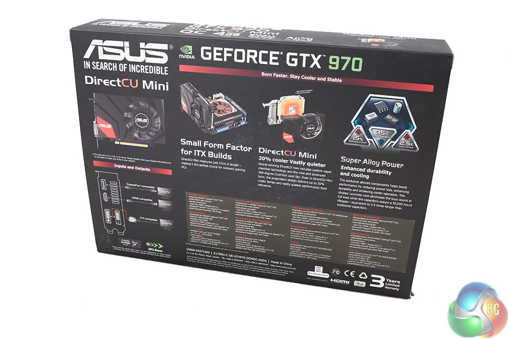 Asus box artwork is instantly recognisable. Along the bottom of the box, are key selling points. The card is indeed overclocked, has 4GB of GDDR5 memory and is ‘perfect' for ITX systems.
