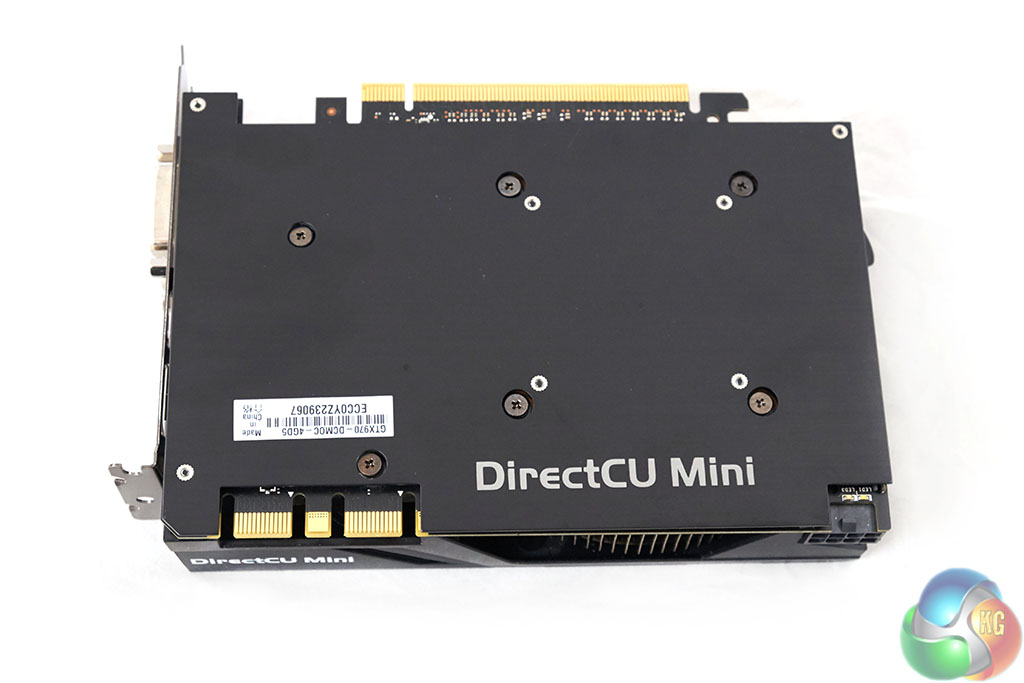 The GTX 970 DirectCU Mini is only 17cm long, 12.19cm high and 4.07cm thick. Asus have included a backplate on the card to help improve appearance and cooling efficiency. It is quite heavy and we like the design, which is effective.