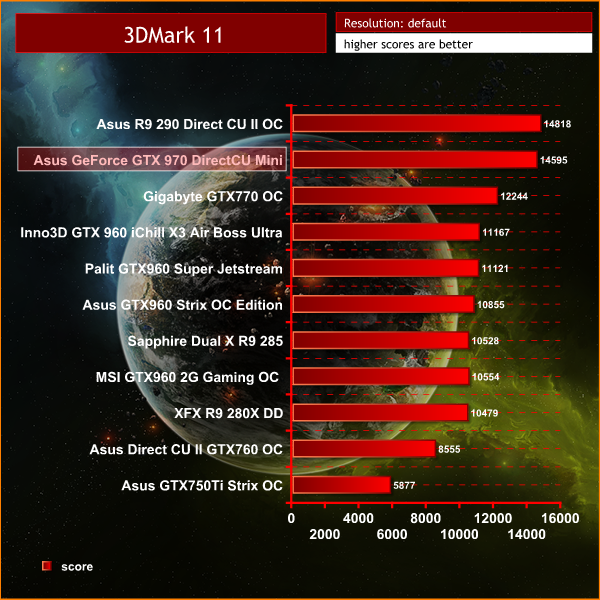 The Asus GeForce GTX 970 DirectCU Mini switches places with the Asus R9 290 Direct CU II OC in this Direct X 11 test, but it is very closely matched.