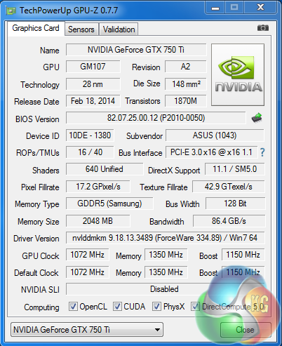 The Asus GTX 750 Ti receives a modest core clock increase, from 1,020 mhz to 1,072 mhz. Unlike the Palit GTX 750 Ti StormX Dual the memory is left at the default speeds of 1,350mhz (5.4Gbps effective). All cards have 16 ROP's, 53 TMU's and 640 CUDA cores.