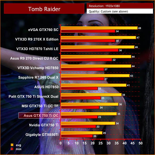The Asus GTX 750 Ti OC drops a little below the sweet spot of 25 frames per second a couple of times, leading to a little juddering on specific parts of the environment. While the extra 2 frames per second seems very small, the Palit GTX 750 Ti StormX Dual gives a smoother overall gaming experience at these settings.