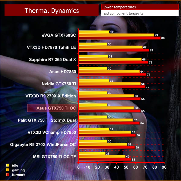 The cooler performs almost identically to the one installed on the Palit GTX 750 Ti StormX – peaking at 58c under gaming load. The Twin Frozr on the MSI GTX750Ti is in a different league, but it is considerably over engineered for a budget gaming card.