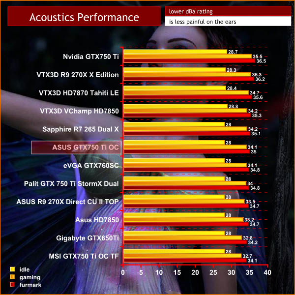 The Asus GTX 750 Ti OC is a quiet solution, rating very close to the Palit GTX 750 Ti StormX Dual.