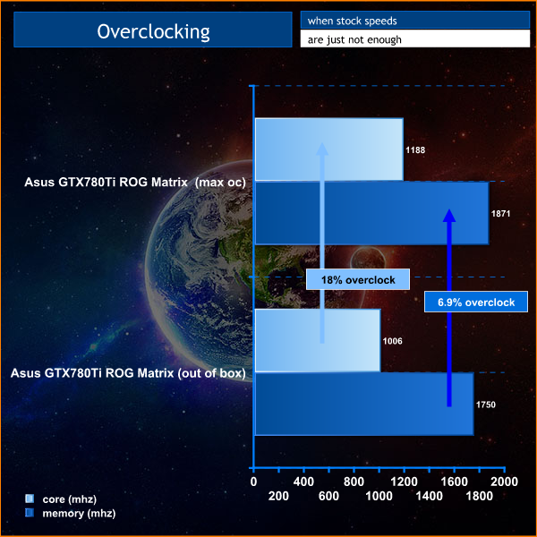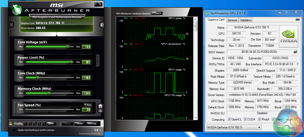 The latest version of ASUS GPU Tweak failed to overclock the core at all, resetting to a 0000 reading. MSI Afterburner (based on Rivatuner) worked fine, which is more than a little ironic!