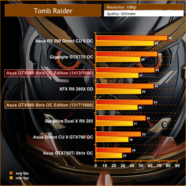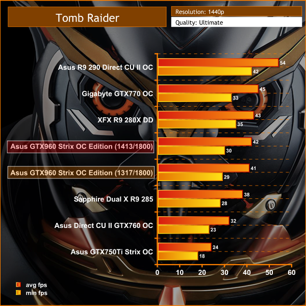 The Asus GTX960 Strix OC can handle both resolutions, although 1080p is a more enjoyable overall experience – the frame rate holds above 40 at all times. At 1440p this drops to around 30 frames per second.