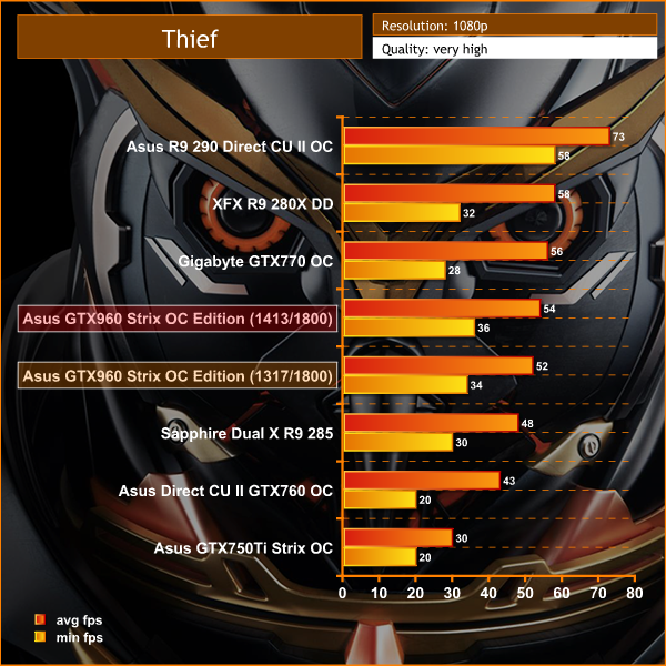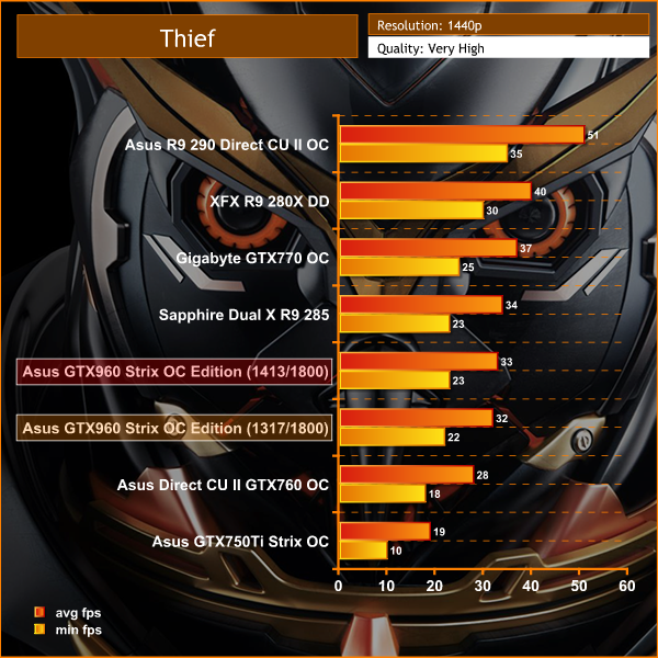 Thief is a very demanding engine and 1440p proves to much for most of the hardware on test today. The Asus GTX960 Strix OC delivers good results at 1080p however, averaging over 50 frames per second.