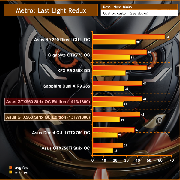On May 22, 2014, a Redux version of Metro Last Light was announced. It was released on August 26, 2014 in North America and August 29, 2014 in Europe for the PC, PlayStation 4 and Xbox One. Redux adds all the DLC and graphical improvements. A compilation package, titled Metro Redux, was released at the same time which includes Last Light and 2033. (Wikipedia). We test with following settings: quality high, SSAA on, 16AF, Tessellation normal.
