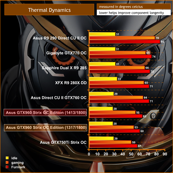 The Maxwell architecture shines in this test. It is extremely efficient and a significant improvement over the last generation. When gaming, the GM206 core on the ASUS card holds steady at 53c. This rises to 60c when tasked with the purely synthetic Furmark stress test. The only card to run cooler is the Asus GTX750Ti Strix OC, another Nvidia Maxwell card.