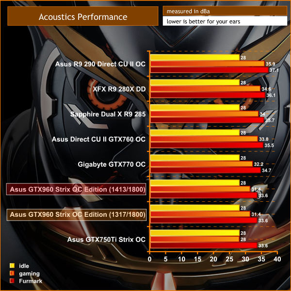 We measure from a distance of around 1 meter from the closed chassis and 4 foot from the ground to mirror a real world situation. Ambient noise in the room measures close to the limits of our sound meter at 28dBa. Why do this? Well this means we can eliminate secondary noise pollution in the test room and concentrate on only the video card. It also brings us slightly closer to industry standards, such as DIN 45635.