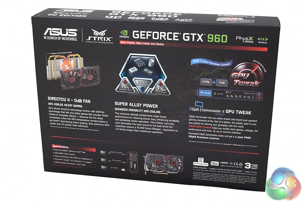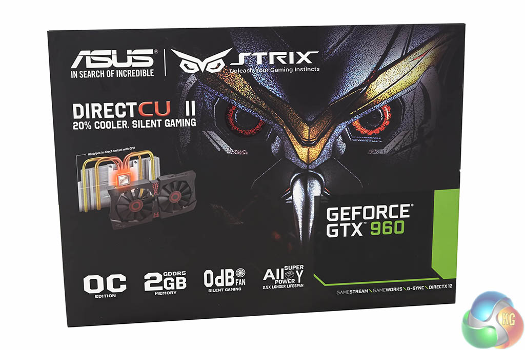 The scary looking STRIX OWL features on the Asus GTX960 box – taking up most of the real estate. A little image of the Direct CU II cooler is visible in the corner.