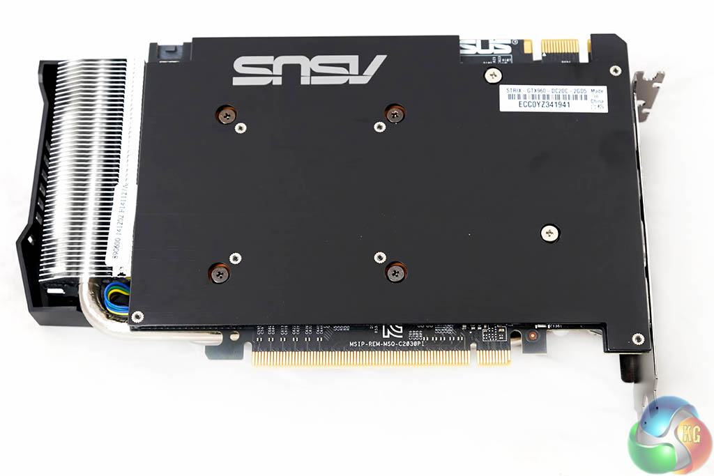 The Asus GTX960 Strix OC ships with Samsung GDDR5 onboard. A single connector on the PCB controls both fans. The cooler is a direct touch design with four thick heatpipes cooling the core, and running into aluminum fins on both sides.