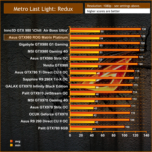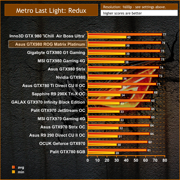 On May 22, 2014, a Redux version of Metro Last Light was announced. It was released on August 26, 2014 in North America and August 29, 2014 in Europe for the PC, PlayStation 4 and Xbox One. Redux adds all the DLC and graphical improvements. A compilation package, titled Metro Redux, was released at the same time which includes Last Light and 2033. (Wikipedia). We test with following settings: Quality-Very High, SSAA-off, Texture Filtering-16x, Motion Blur-Normal, Tessellation-Normal, Advanced Physx-On.