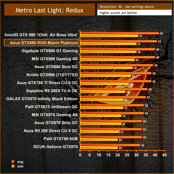 On May 22, 2014, a Redux version of Metro Last Light was announced. It was released on August 26, 2014 in North America and August 29, 2014 in Europe for the PC, PlayStation 4 and Xbox One. Redux adds all the DLC and graphical improvements. A compilation package, titled Metro Redux, was released at the same time which includes Last Light and 2033. (Wikipedia). We test with following settings: Quality-High, SSAA-off, Texture Filtering-16x, Motion Blur-off, Tessellation-Normal, Advanced Physx-off.