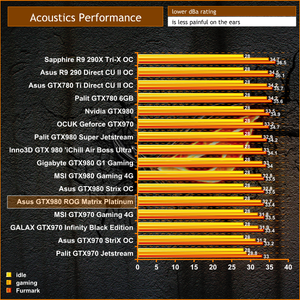 We measure from a distance of around 1 meter from the closed chassis and 4 foot from the ground to mirror a real world situation. Ambient noise in the room measures close to the limits of our sound meter at 28dBa. Why do this? Well this means we can eliminate secondary noise pollution in the test room and concentrate on only the video card. It also brings us slightly closer to industry standards, such as DIN 45635.