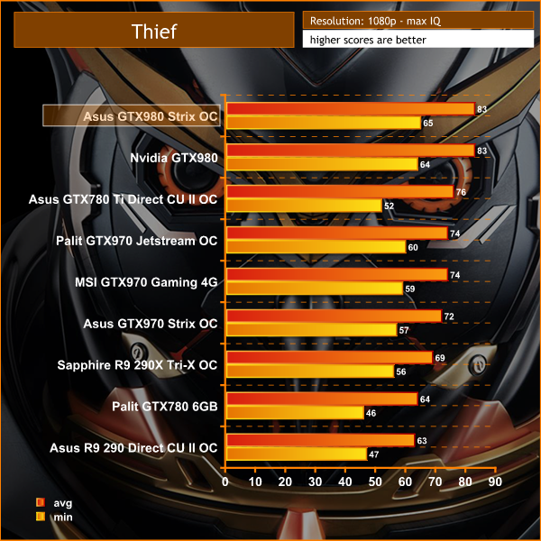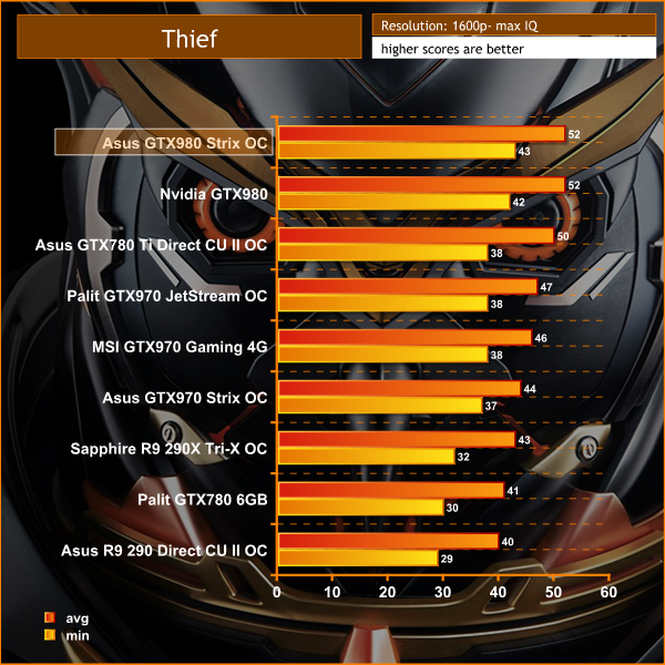 Thief is difficult to power at high image quality settings, but the Asus GTX980 Strix OC can deal with the engine at both 1080p and 1600p.