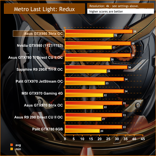 On May 22, 2014, a Redux version of Metro Last Light was announced. It was released on August 26, 2014 in North America and August 29, 2014 in Europe for the PC, PlayStation 4 and Xbox One. Redux adds all the DLC and graphical improvements. A compilation package, titled Metro Redux, was released at the same time which includes Last Light and 2033. (Wikipedia). We test with following settings: Quality-High, SSAA-off, Texture Filtering-16x, Motion Blur-off, Tessellation-Normal, Advanced Physx-off.