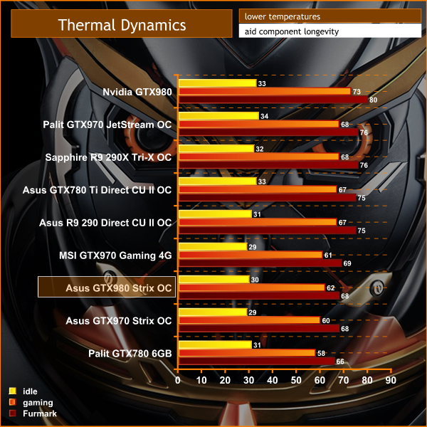 The Asus GTX980 Strix OC has a fantastic cooling system – it holds gaming temperatures around the 60-62c threshold which is 11c cooler than the reference GTX980.