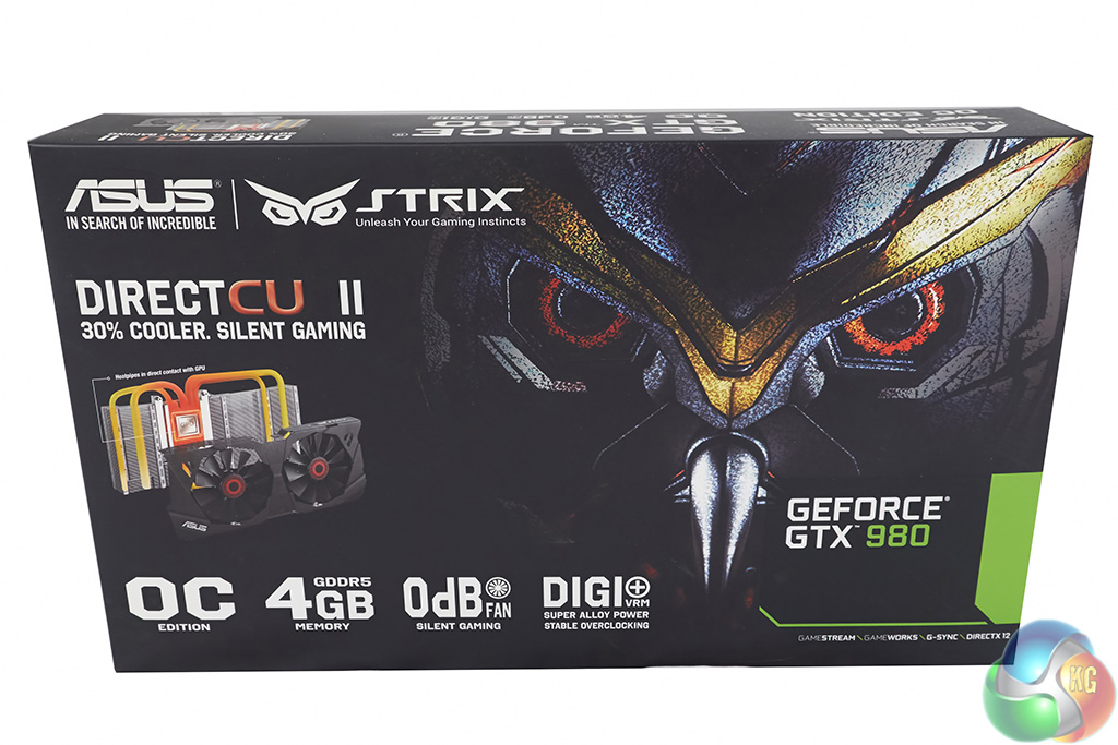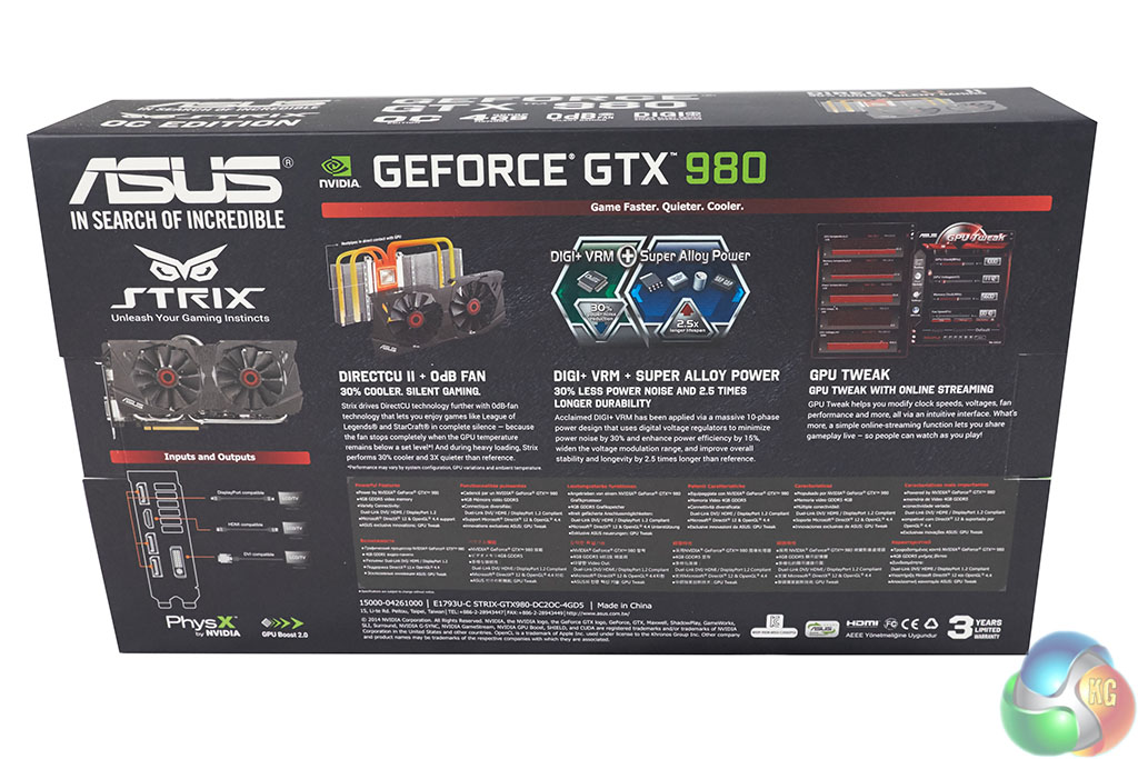 The Strix robotic OWL artwork is both menacing and slightly corny at the same time. No images of the card on the front of the box, just a list of key selling points such as ‘OC' and ‘4GB' – indicating the card is overclocked and ships with 4GB of memory.