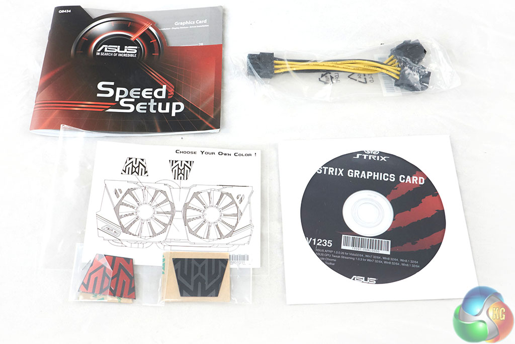 The bundle includes a power converter cable, software disc and literature on setting up the graphics card. Asus also supply several colours of sticker which can be applied to the cooler by the user. They include a little graphic to explain where they go.