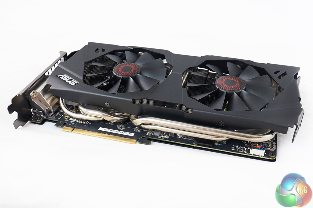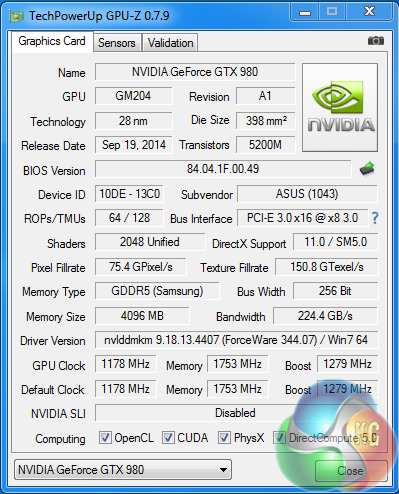 The GTX980 is built on the 28nm process. It has 2,048 Cuda Cores, 64 ROP's and 128 Texture units. The 4GB of Samsung GDDR5 is clocked at 1,753mhz (7Gbps effective) and is connected via a 256bit memory interface. The core clock speed has been increased by ASUS to 1,178mhz with a boost speed set at 1,279mhz.