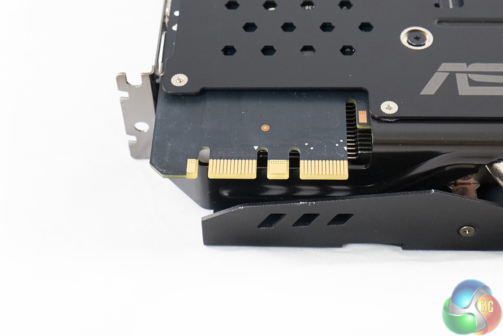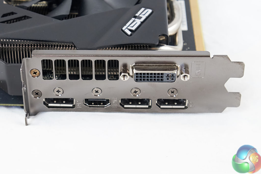 ASUS have three DisplayPort connectors available on the I/O backplate, alongside an HDMI 2.0 capable connector. This HDMI port will handle 4K resolutions at up to 60hz. There is also a dual link DVI connector on the top row. Up to four of these output connectors can be used simultaneously.